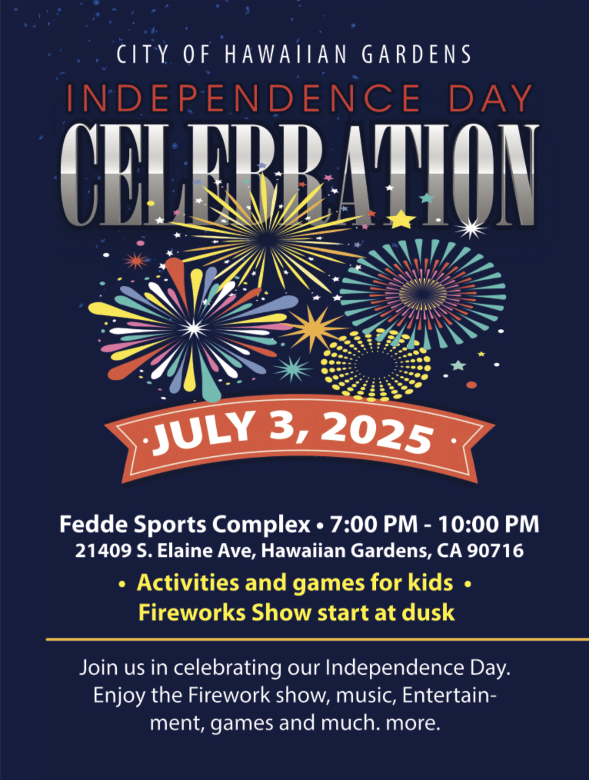 Celebrate with food, music, games, kid zone and fireworks show.