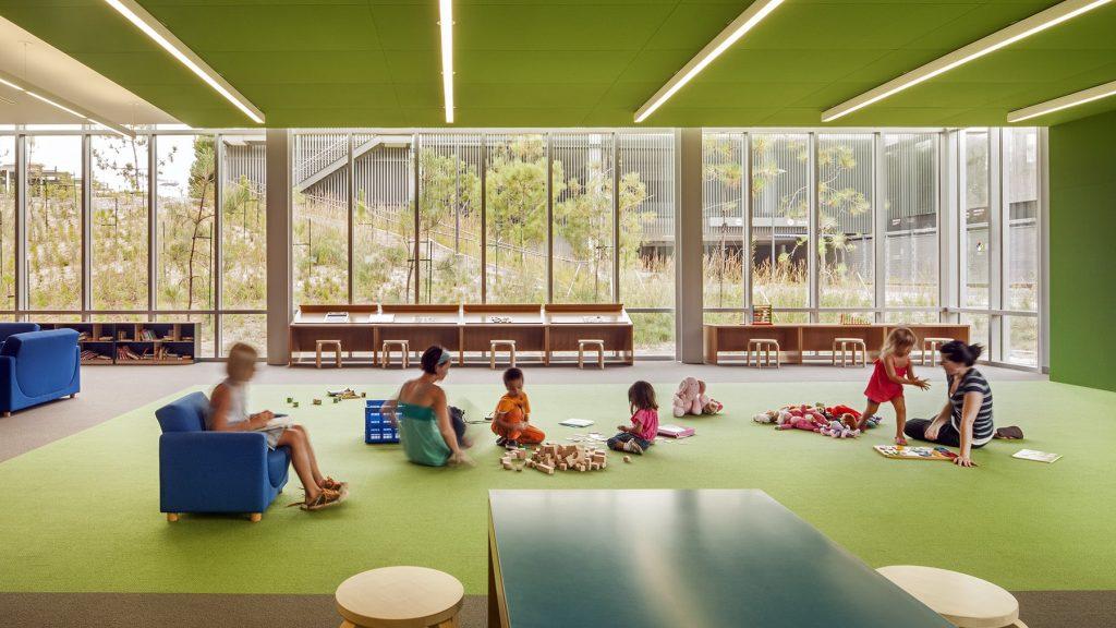 This modern space features whimsical cloud-like lights, a family reading nook, a technology hub, and an outdoor play area. Fun fact: the shelving is spaced for kids to sit and explore comfortably.