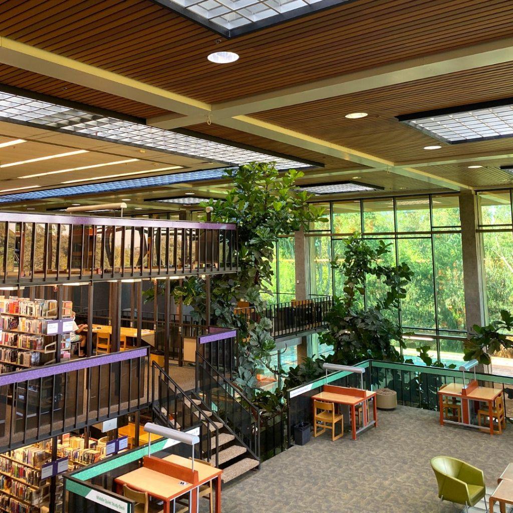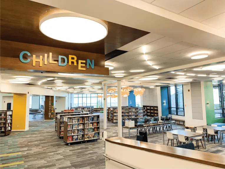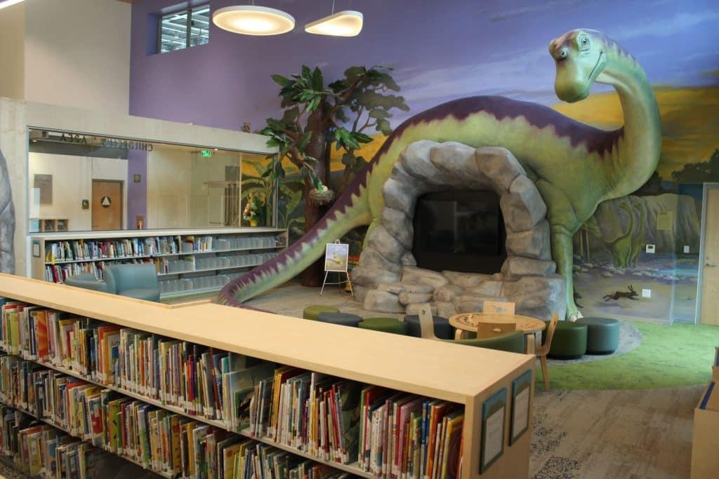 This library offers a spacious and welcoming children’s area, complete with a dinosaur sculpture and regular story time sessions. Its modern design and kid-friendly programs make it a favorite for families in the area.
