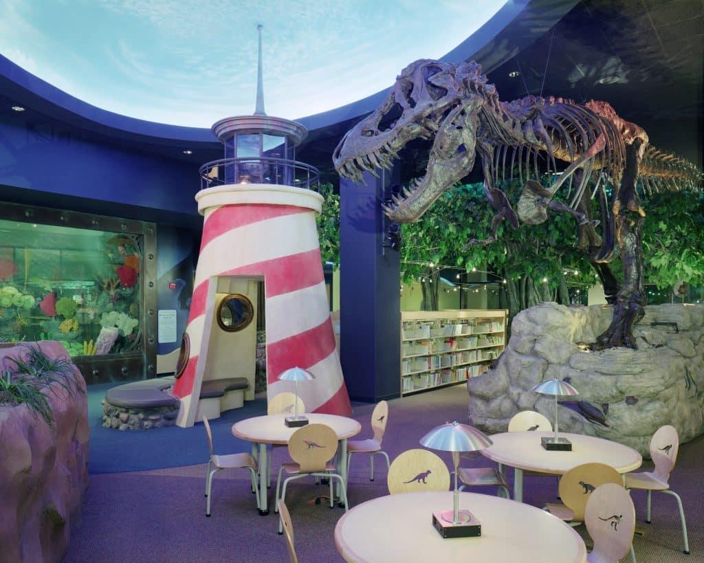 Renowned for its 15,000-gallon saltwater aquarium and a 40-foot-long authentic replica of a T.rex fossil. There’s also a lighthouse, rainforest tree, and space shuttle model for kids to explore. The children’s area also features a LIttle Theater and Arts Studio used for special programs.