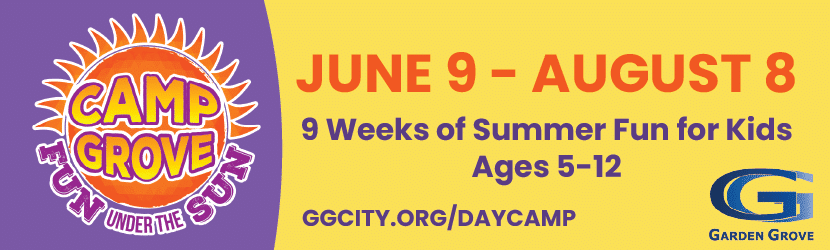 Garden Grove- Camp Grove: Fun Under the Sun provides a fun and exciting experience for children (ages 5-12). Recreational activities include arts and crafts, field games, and weekly excursions. June 9 – August 8. Counselor-in-