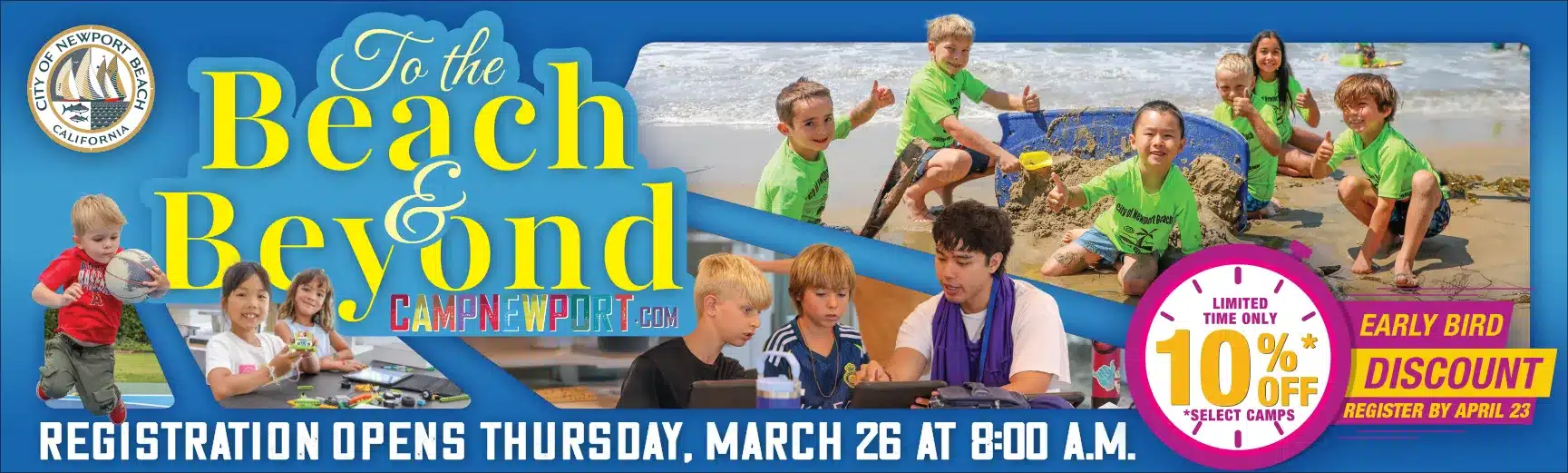 Newport Beach – Camp Newport offers kids (ages vary) the chance to surf, sail, play sports, explore STEM, and get creative with hundreds of full and half-day summer camps. June 1 – August 21, 2026. Read More