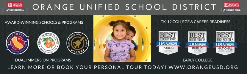 Orange, Villa Park, Anaheim, Garden Grove, Santa Ana, and more – Orange Unified School District is a nationally recognized public school district offering a wide range of educational choices for families, including innovative dual-language programs in Spanish/English and Mandarin/English. In 2025, fifteen elementary and four middle schools were named among the “Best” in the Nation, alongside their three high schools, honored as U.S. News & World Report’s “Best” for five consecutive years. Discover the OUSD difference! Read More