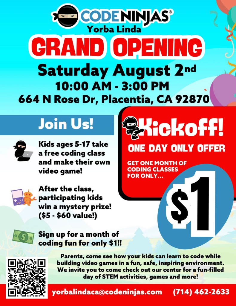 Celebrate the grand opening of Code Ninjas with a day of hands-on fun for kids and families. Kids and teens (ages 5-17) can take a free coding class, build their own video game, and even win a mystery prize. Families can explore the center, meet the team, and enjoy a full lineup of STEM activities.