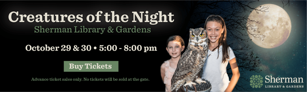 Enjoy an eerie garden walk and discover what plants do after dark. Toxic specimens, night blooming plants, and the Forbidden Jungle await! Dissect an owl pellet in the Nocturnal Alley, and create your own baby owlet pinecone craft.
