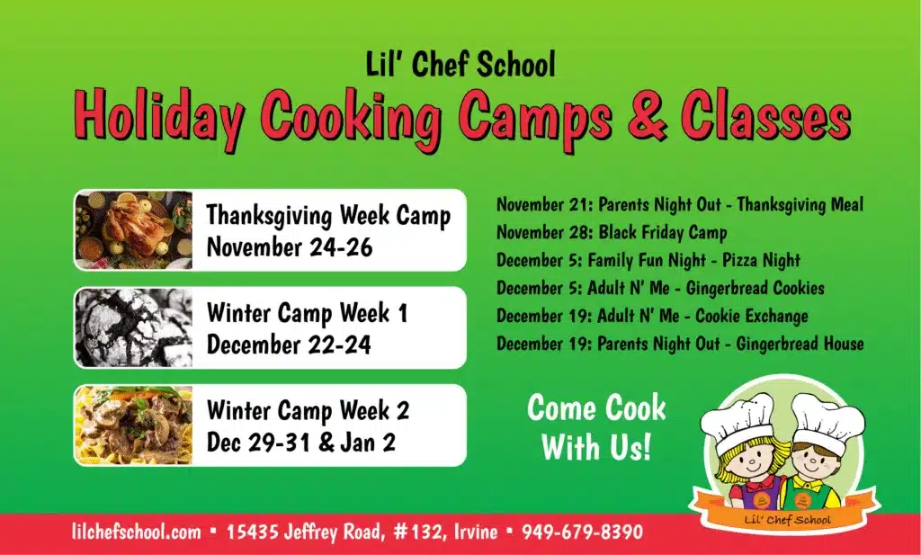 Tiny Chefs, ages 3-5, still need adults by their side as they learn. Lil’ Chef School focuses on hands-on cooking classes that allow an adult to assist their little ones in measuring dry and wet ingredients. Each adult has the choice to cook alongside their child or just assist, depending on their age and capabilities. Today: Bake two different cookies for a cookie exchange to share with the family.