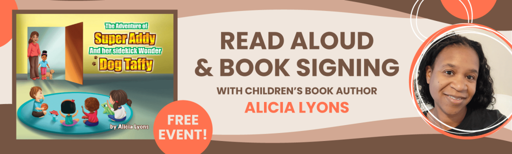Join children’s author Alicia Lyons as she reads her first book, The Adventure of Super Addy and her Sidekick Wonder Dog Taffy.
