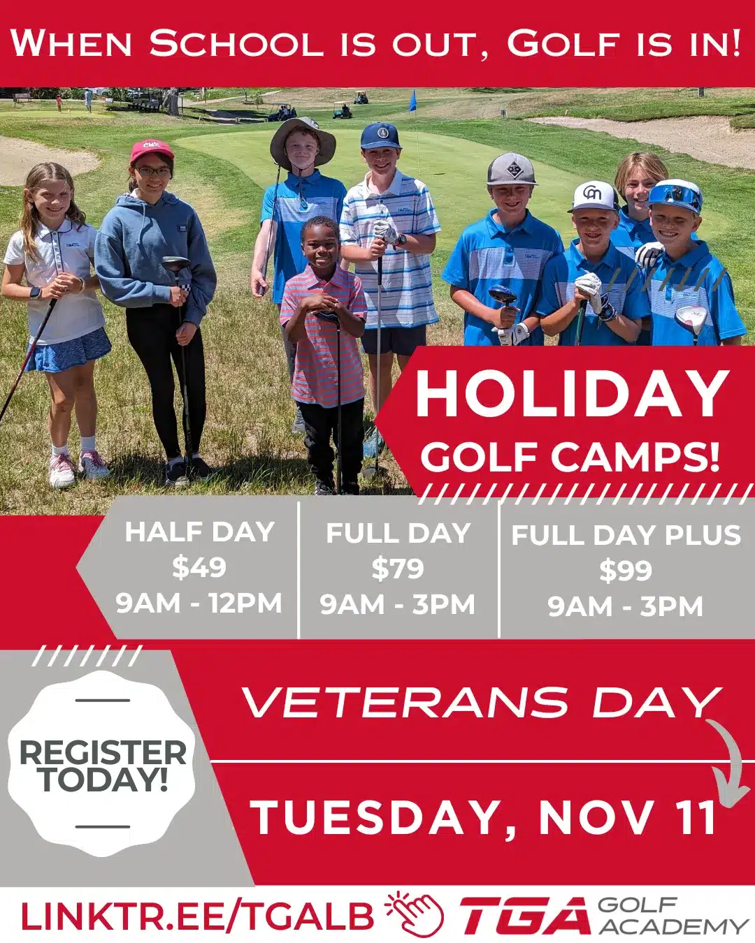 When school is out, golf is in! Kids can join TGA Golf Academy for their popular, fun-filled golf camps this fall. These school holiday camps offer a chance for players of all skill levels to build fundamentals, stay active, and enjoy time outdoors.