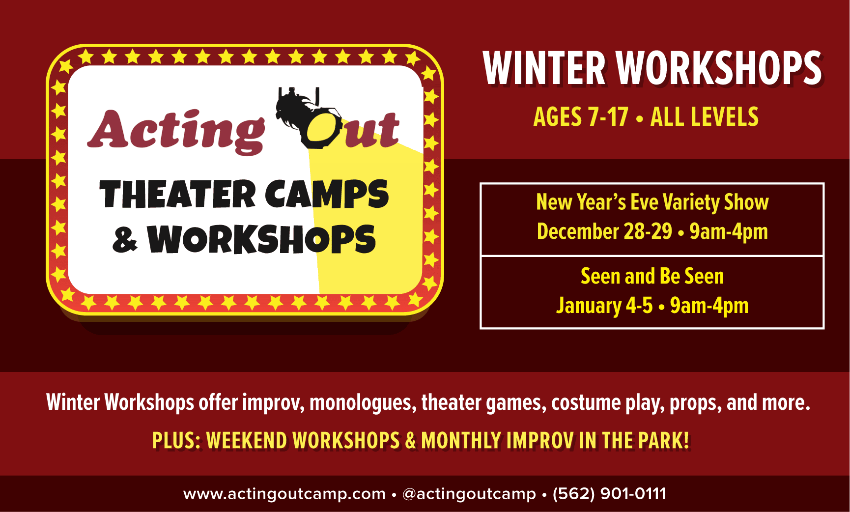 Acting Out is offering fall and winter workshops designed to keep your young actors engaged and inspired. Veterans Day Workshop (Nov 11), Thanksgiving (Nov 25-26), Winter Break (Dec 23 & Jan 2-3).