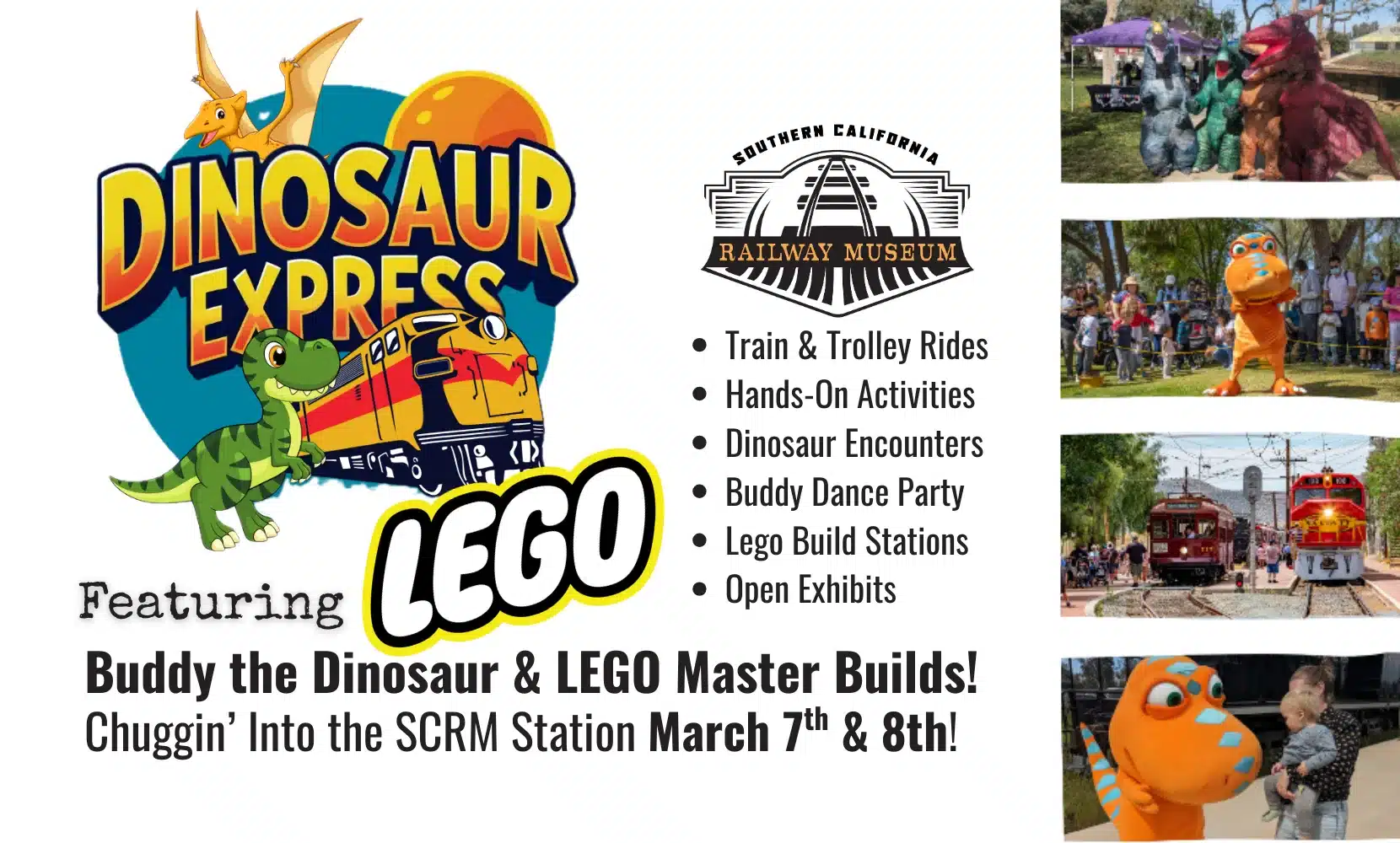 March 7-8: Meet Buddy the Dinosaur, ride the train with resident dinos, and explore Lego build zones and STEAM activities during this two-day Dinosaur Express event.