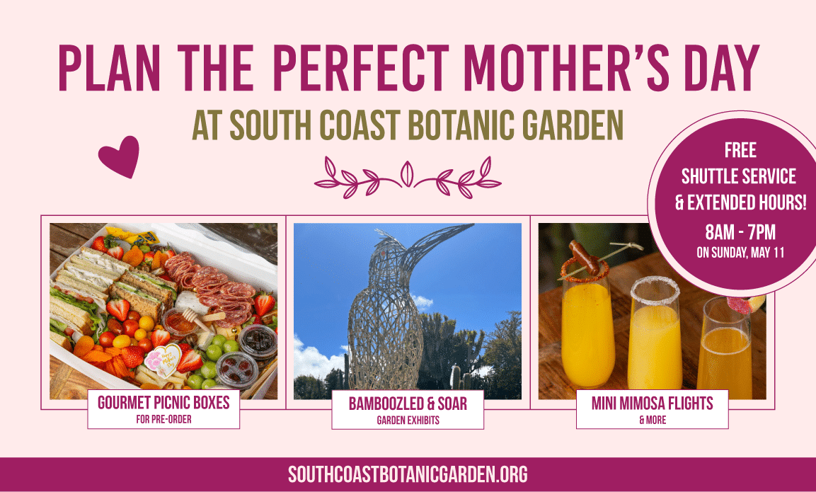 May 11: Spend Mother’s Day at South Coast Botanic Garden with picnic options, butterfly encounters, and a bamboo bird adventure—plus extended hours and plenty of blooms.