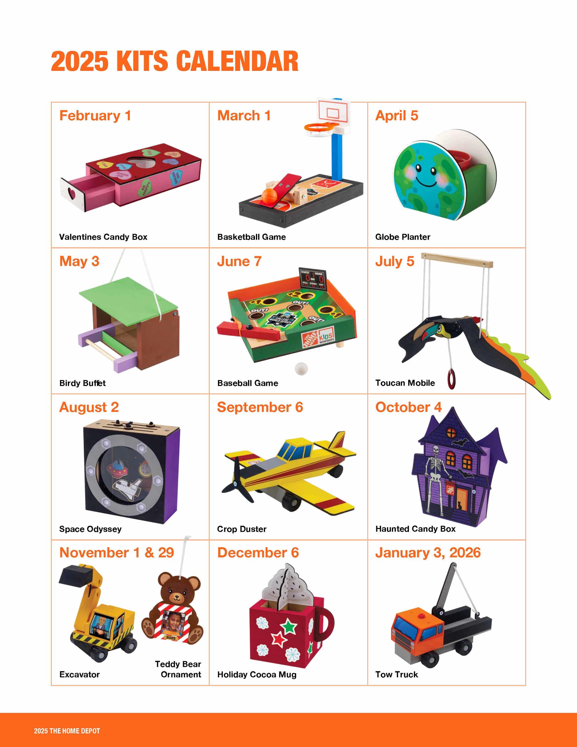 Workshops happen the first Saturday of each month at 9am in Home Depot stores nationwide, while supplies last. Registration is encouraged so your child has a kit ready to go. Learn more and register at www.homedepot.com/c/kids-workshop.