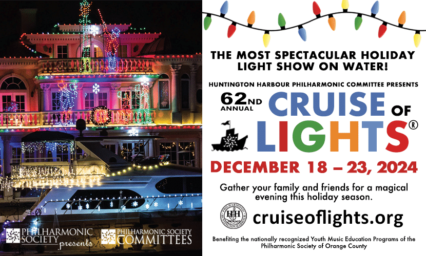 The Huntington Harbour Philharmonic Committee Cruise of Lights® offers 50-minute narrated boat tours through the waterways of Huntington Harbour in Huntington Beach, California. In December both locals and visitors share the beauty of thousands of lights and animated displays on brightly decorated homes, docks, decks and boats.