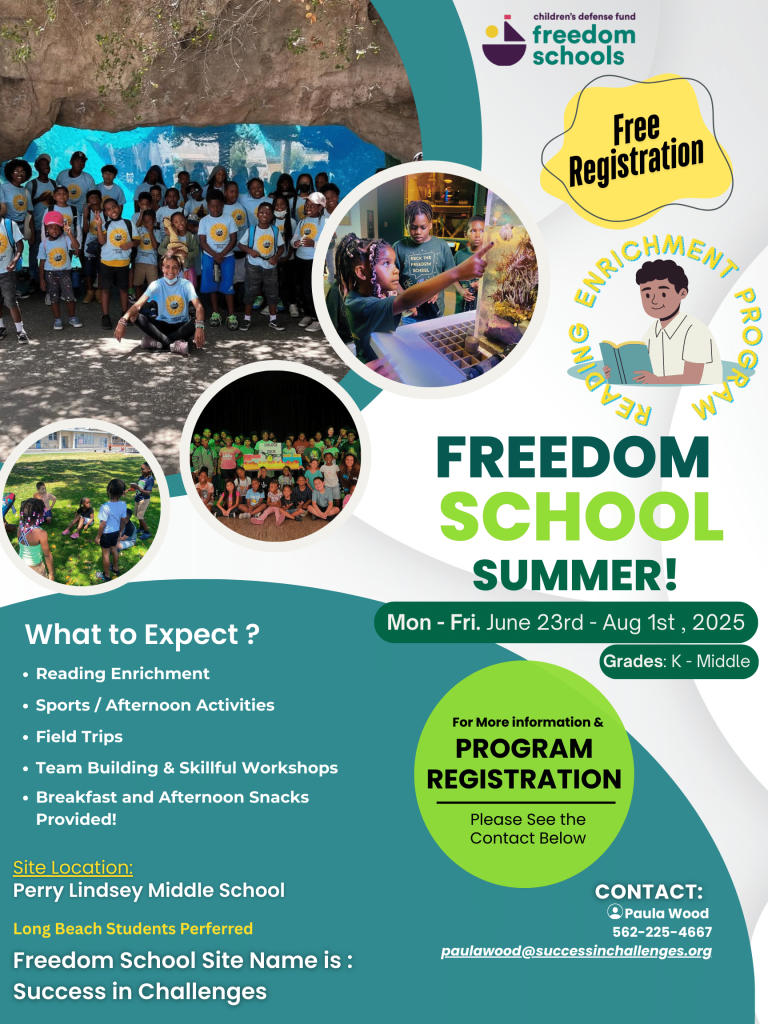 Freedom School offers a free summer enrichment program focused on reading, team building, field trips, and fun activities for students (Grades K – Middle School). Campers enjoy reading enrichment, sports, workshops, breakfast and afternoon snacks, and a dynamic environment that fosters academic and personal growth.
