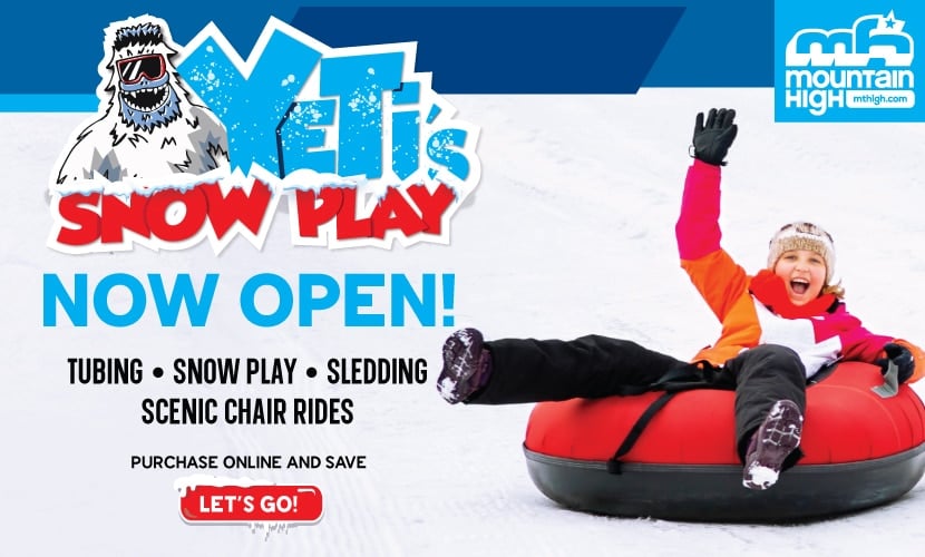 Make it a snow day at Yeti’s Snow Play located at Mountain High Resort. Slide down the tubing lanes, meet the Yeti and his friends, or have lunch at the Grand View Lodge located at 8,200ft. Mountain High also offers skiing and snowboarding, rentals, and lessons. Visit their calendar to see when they’re open.
