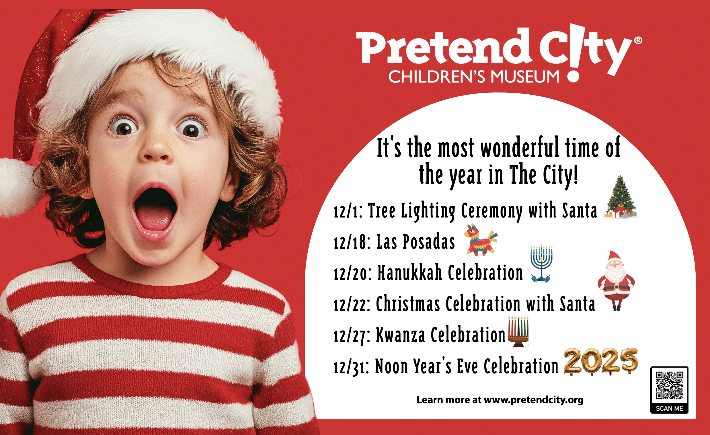 DECEMBER 1-31: Celebrate the magic of the holidays all month long at Pretend City. Engage in fun holiday traditions from around the world. Las Posadas (12/18), Hanukkah (12/26), Kwanzaa (12/27)